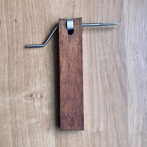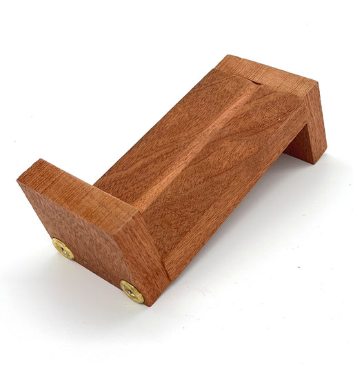 Shooting board made from wood. Helps keep the cane in place while gouging and protects the table.